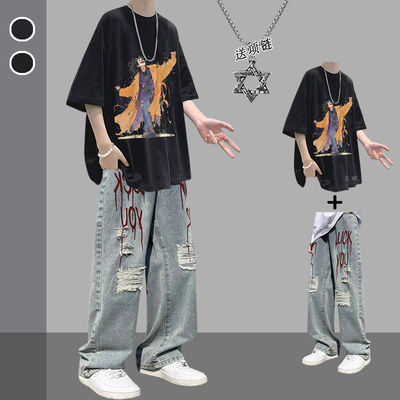 美式潮牌短袖T恤男生夏季套装高街破洞牛仔裤痞帅潮流炸街一整套