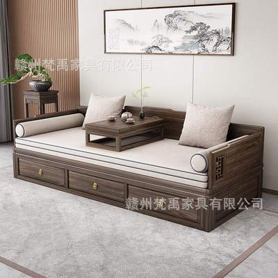 新中式实木罗汉床金花梨木推拉客厅榻伸缩储物带抽箱体式沙发床