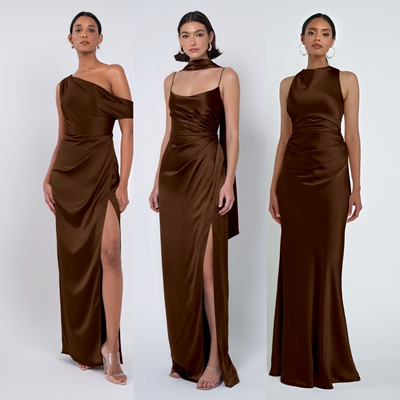 绝美气质咖啡色缎面伴娘服姐妹团礼服小众高级感伴娘裙大码