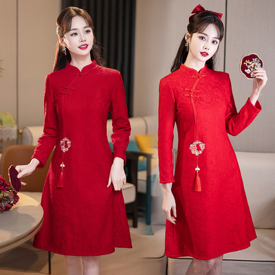 小个子红色旗袍2025春秋季新款复古国风改良长袖连衣裙新娘敬酒服