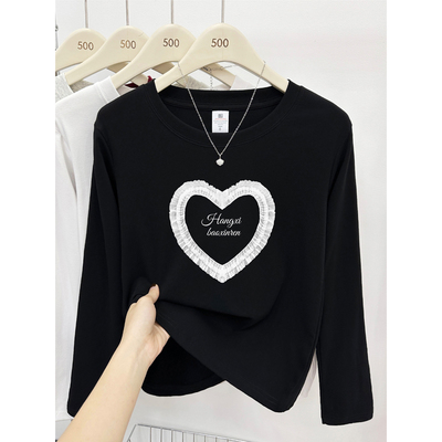 韩版设计感蕾丝爱心印花长袖t恤女装胖mm大码圆领正肩上衣秋冬季