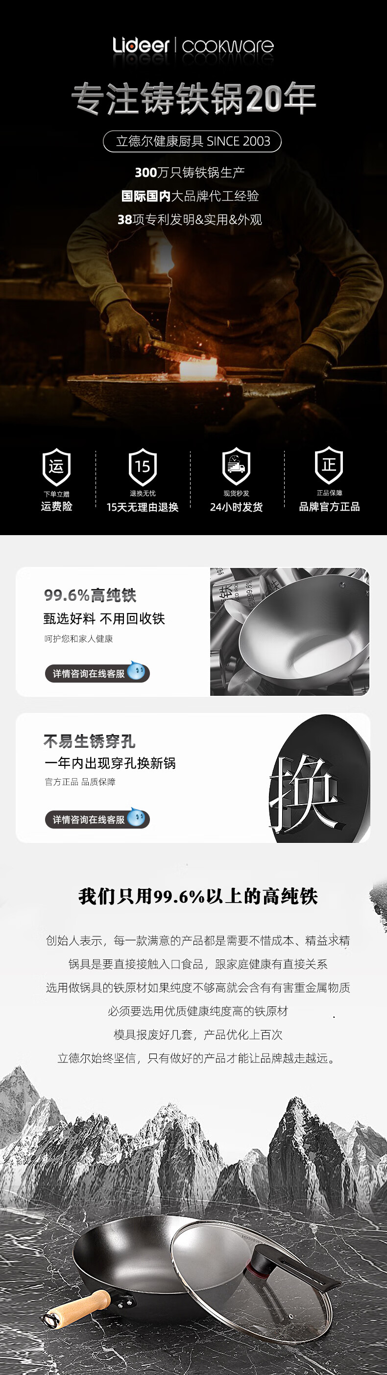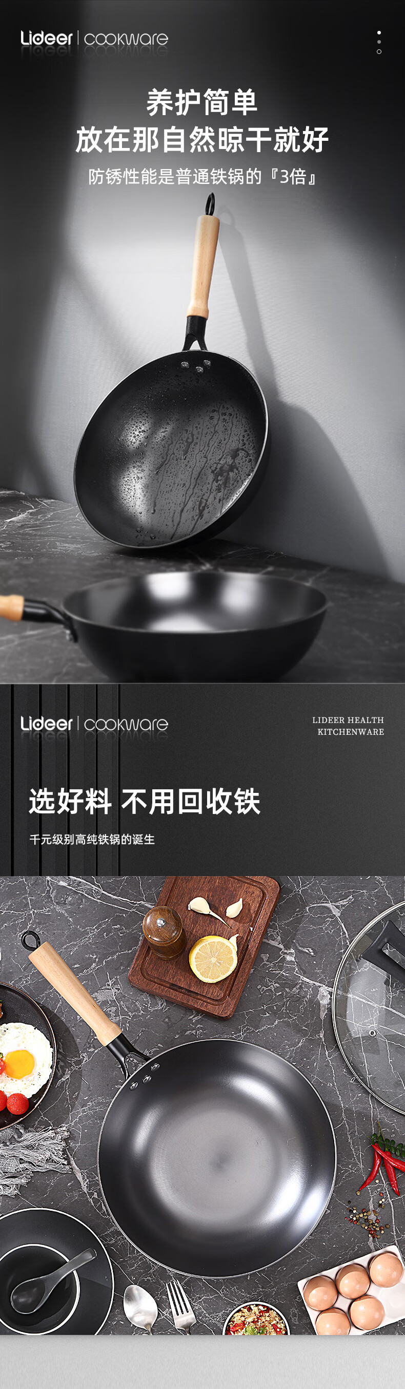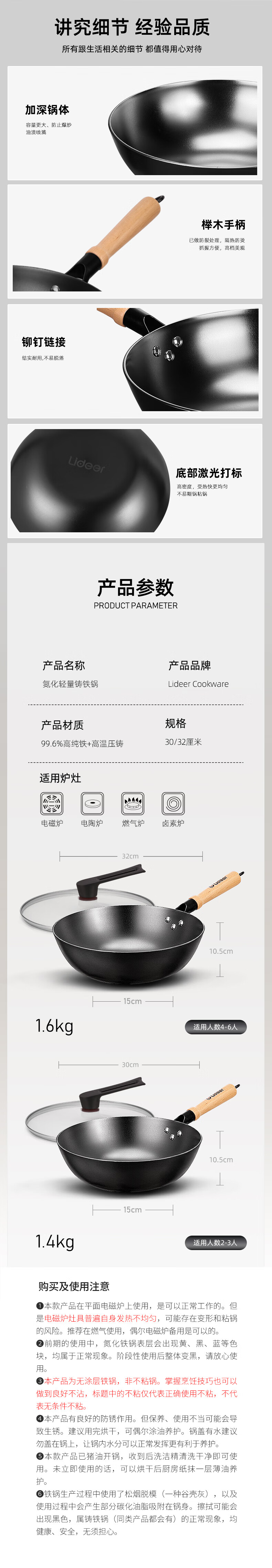 LIDEER COOKWARE立德尔炒锅铸铁锅无涂层平底锅家用炒菜锅电磁炉燃气通用烹饪锅具 【氮化轻量铸铁炒锅】带盖 28cm