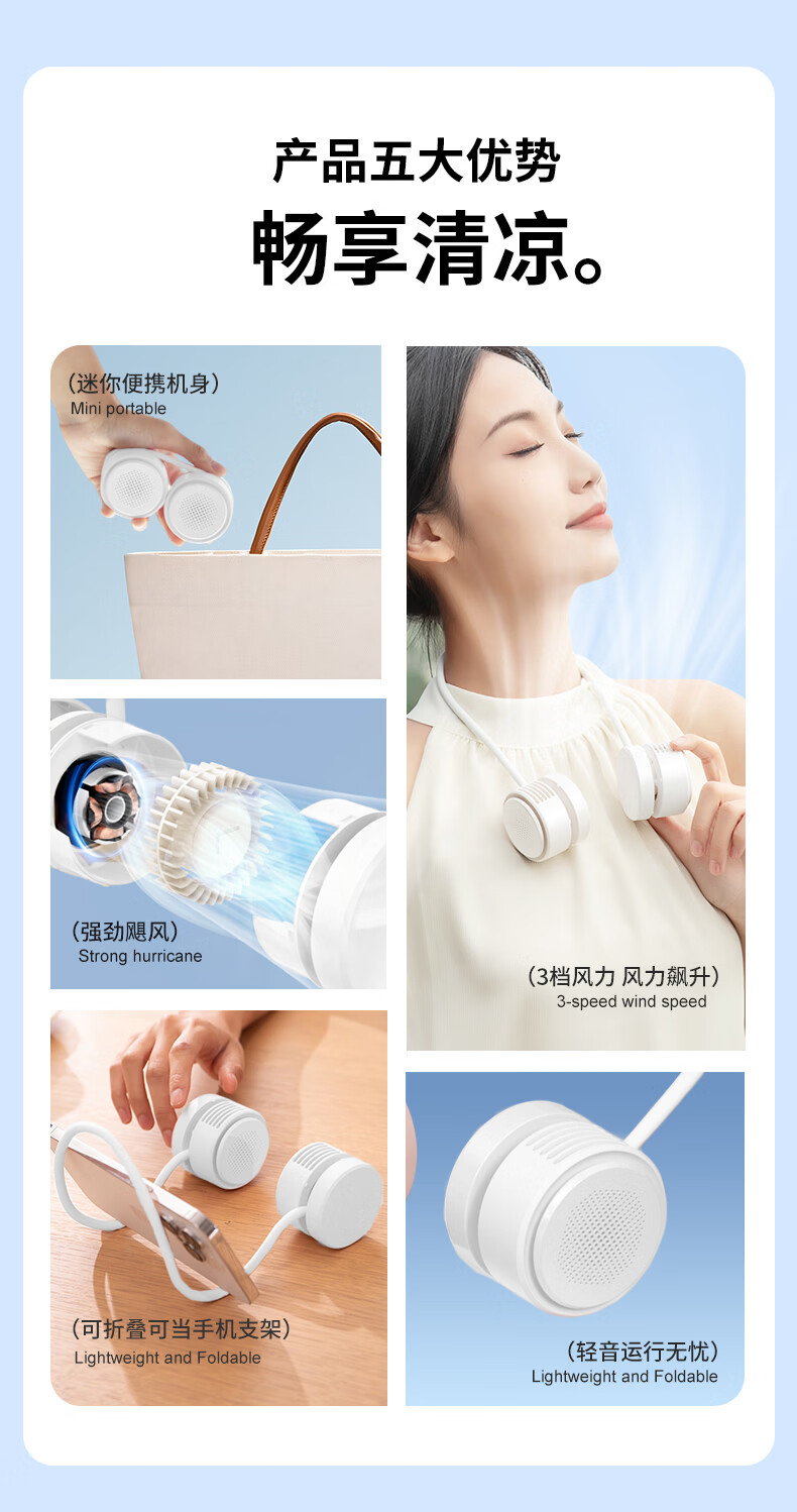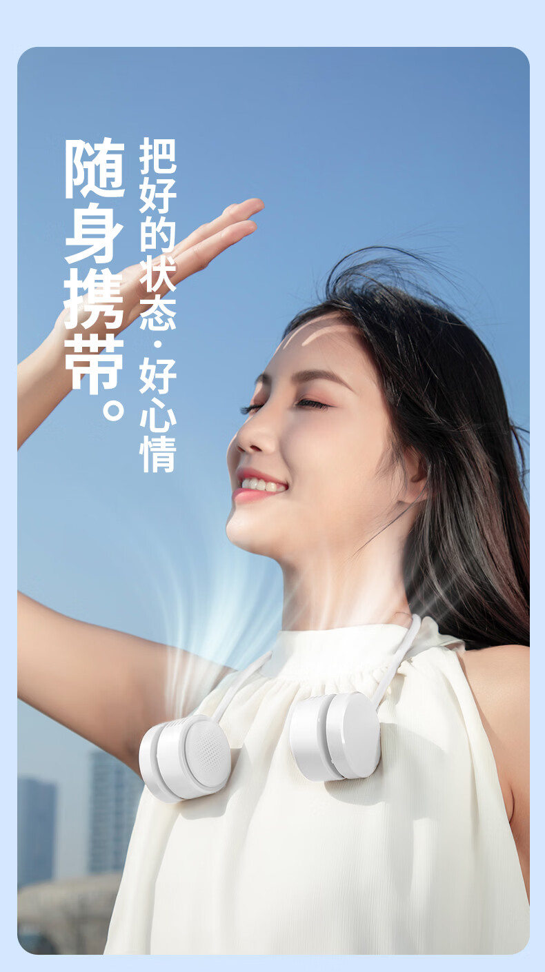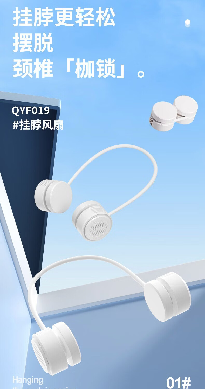 千喻挂脖懒人风扇迷你充电无叶收纳便携式usb颈脖子小型新款小风扇 QYF019冰川白