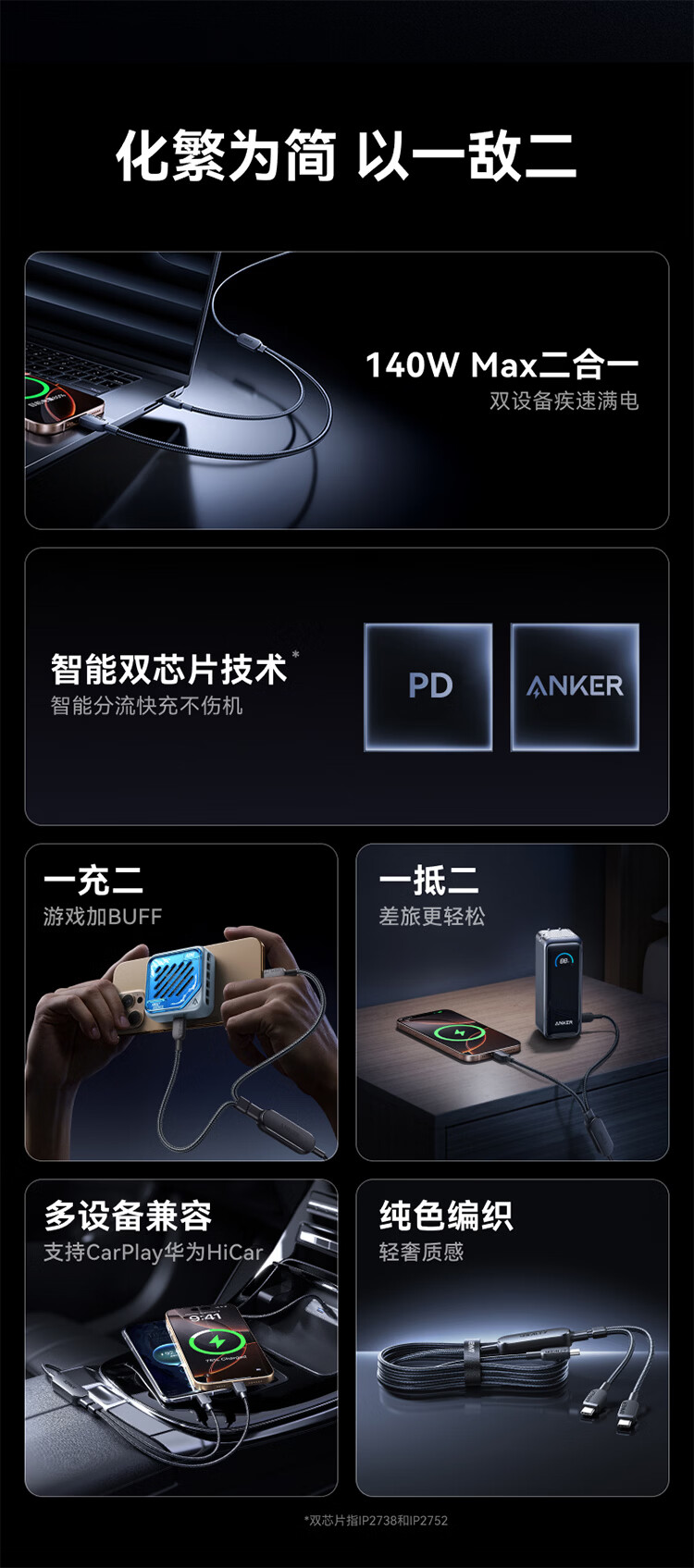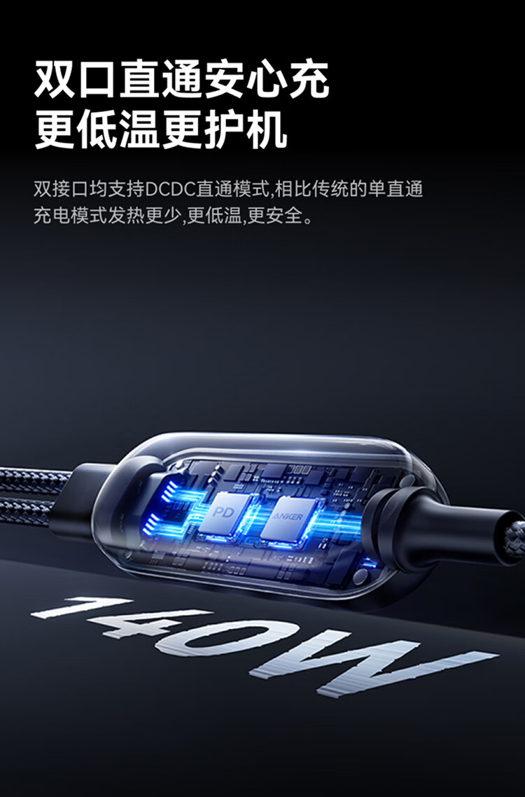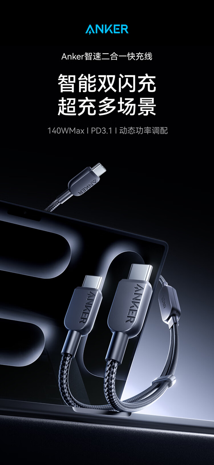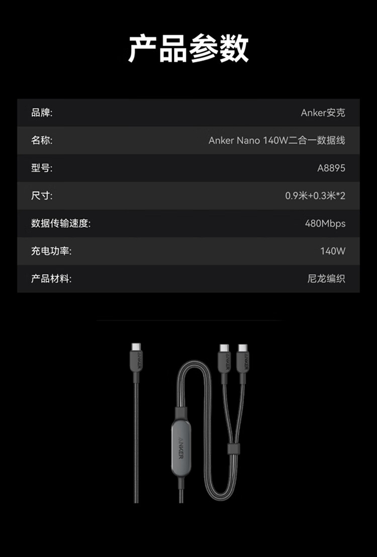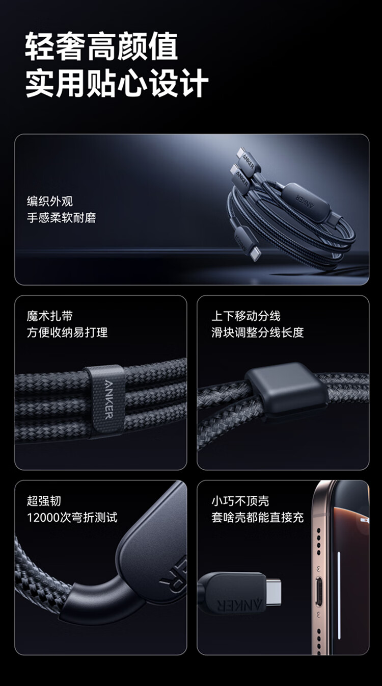ANKER安克【二合一数据线】140W二合一双type-c数据线充电器充电宝车载充电线适用苹果17iPhone16华为 【一拖二】140W|1.2米|黑色