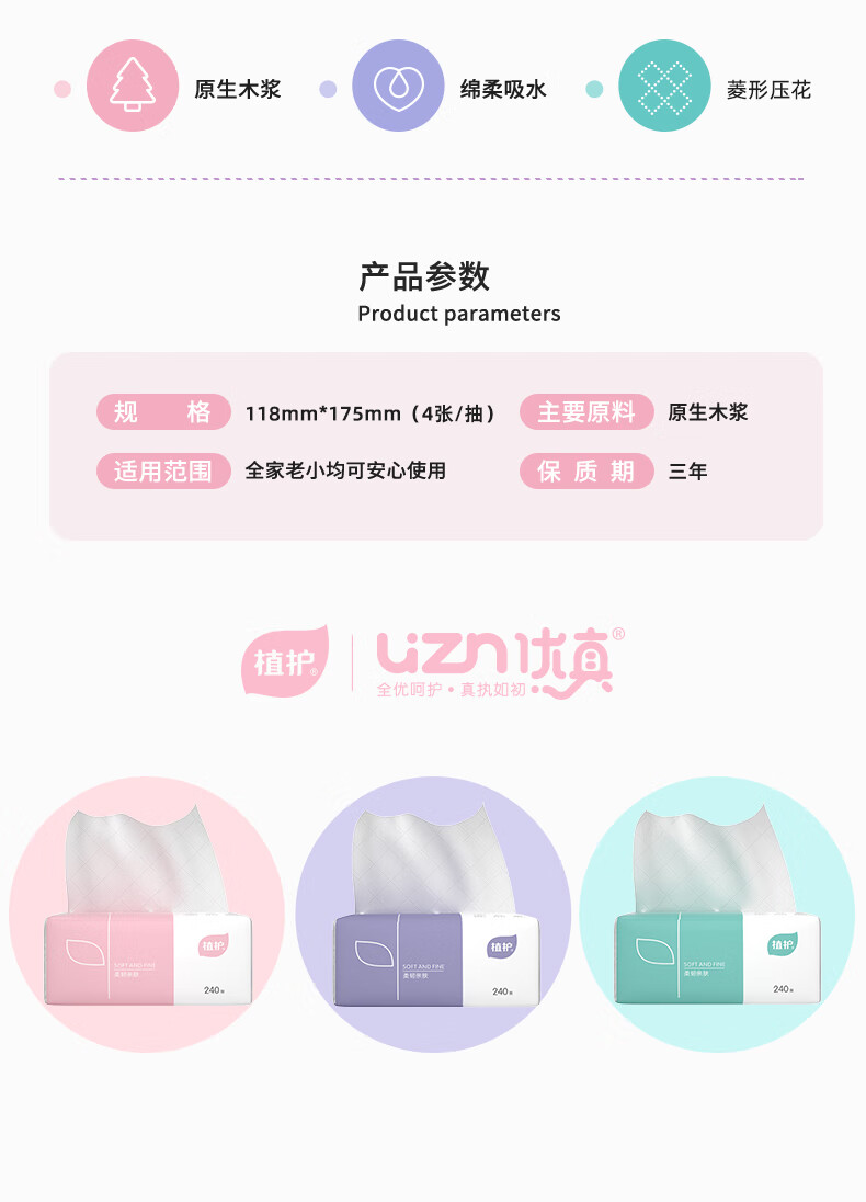 植护优真 三色花抽纸4层240张 三色花 4层 60抽*6包